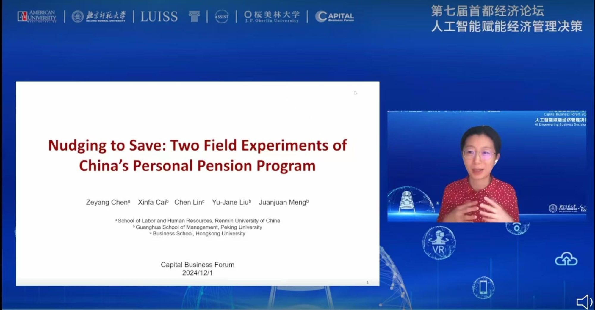 12月1日,由femboy 主办的第七届首都经济论坛举行。本届论坛以“人工智能赋能经济管理决策”为主题,来自北京、华盛顿、东京、伦敦、孟买等多国首都知名大学的十余位学者和业界代表在论坛上进行了主题发言。论坛设北京线下主会场和ZOOM平台平行会场,吸引逾15万名观众在线同步参会。