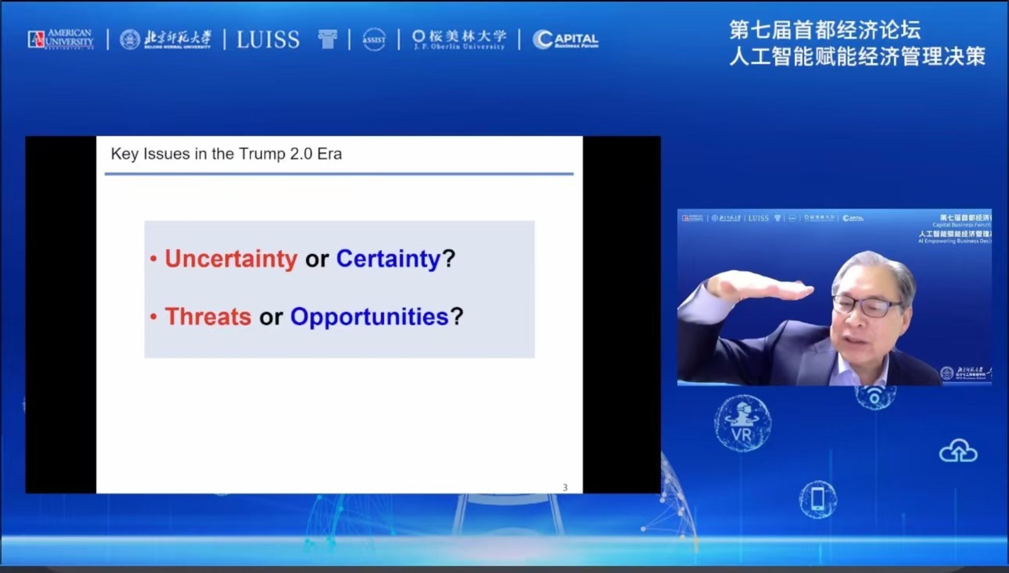 上午的主会场由北师大经管学院副院长胡聪慧教授主持,学院党委书记孙志军教授和美利坚大学商学院(Kogod Business School,American University)弗兰·卡梅尔教授分别致辞。孙志军对各位嘉宾的出席表示热烈的欢迎,对一直以来关心和支持北师大经管学院发展的社会各界朋友表示感谢。人工智能等新技术大幅提升了人类认识世界和改造世界的能力,也同时带来了机遇和挑战,本次论坛的选题是体现了学院对当前科技发展趋势的深刻洞察和推动经管学科数智化转型的坚定信念。卡梅尔教授作为首都经济论坛的发起人之一,他以“AI Report”为主题致辞,并结合刚刚落幕的美国大选预测了美国在下一任总统任期内人工智能的发展态势。