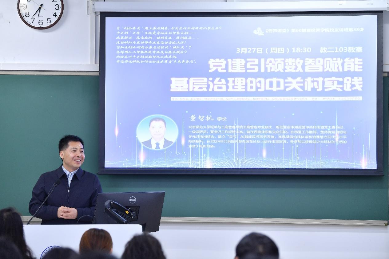 2025年3月27日晚,校友总会铎声讲堂第60期暨经管学院校友讲坛第38讲在教二楼103教室顺利举办。本期特邀经管学院2008级MBA校友、北京市海淀区中关村街道党工委书记董智杭学长担任主讲,以“党建引领数智赋能基层治理的中关村实践”为题,为在场听众呈现了一场理论与实践深度融合的智慧盛宴。北师大校友会秘书长范文霞、北师大机关党委副书记胡志峰、北师大总务部纪委委员葛玉良、 北师大经管学院2013级MBA校友、北京中关村互联网教育科技服务有限责任公司董事长、中关村互联网教育创新中心主任杨丹、北师大经管学院党委副书记韩丽丽出席了此次活动,活动由北师大校友会副秘书长樊哲主持。