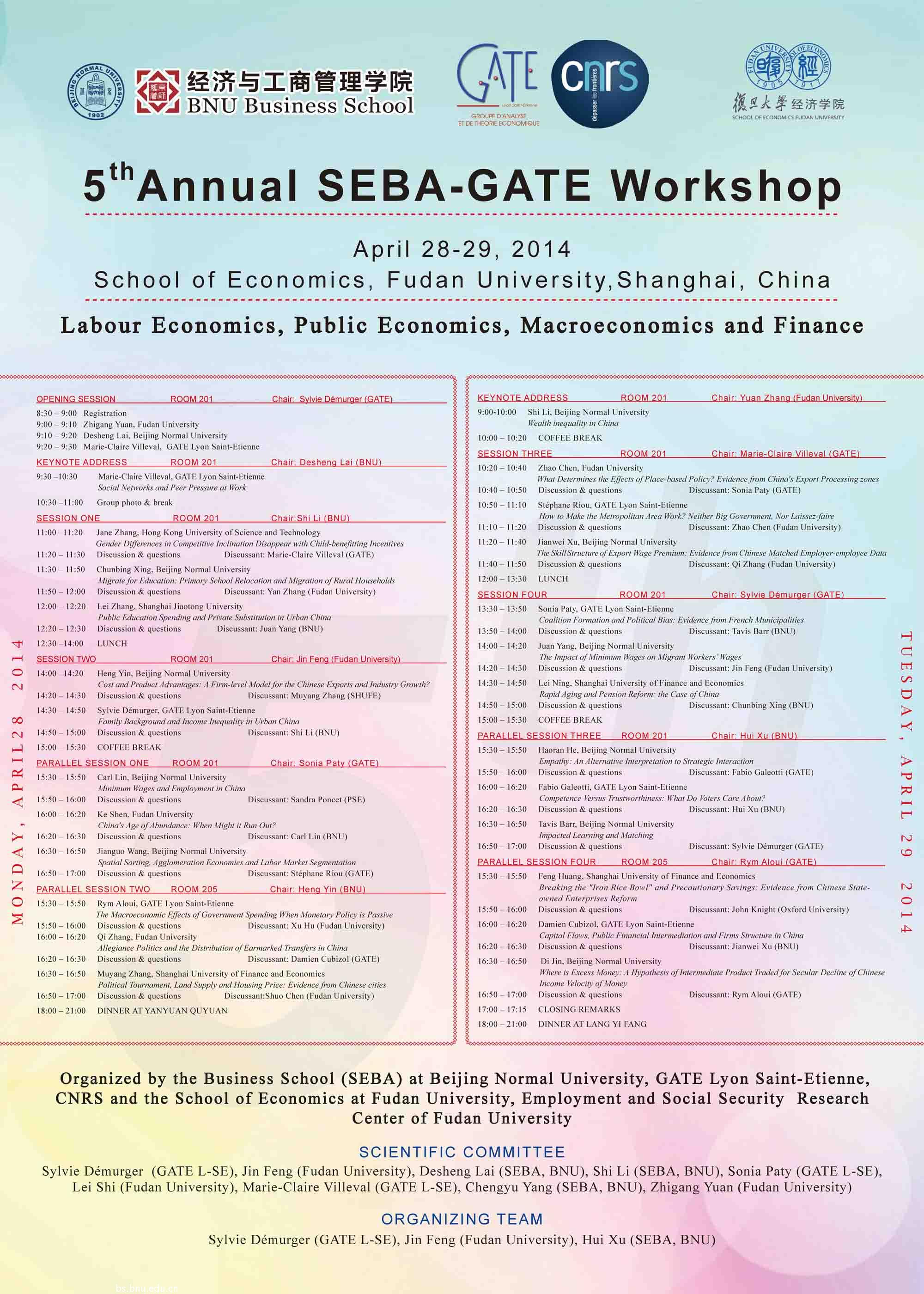 (SEBA)与法国GATE经济学实验室以及复旦大学经济学院联合举办的第五届SEBA-GATE研讨会于2014年4月28日-29日在上海复旦大学经济学院成功举行。