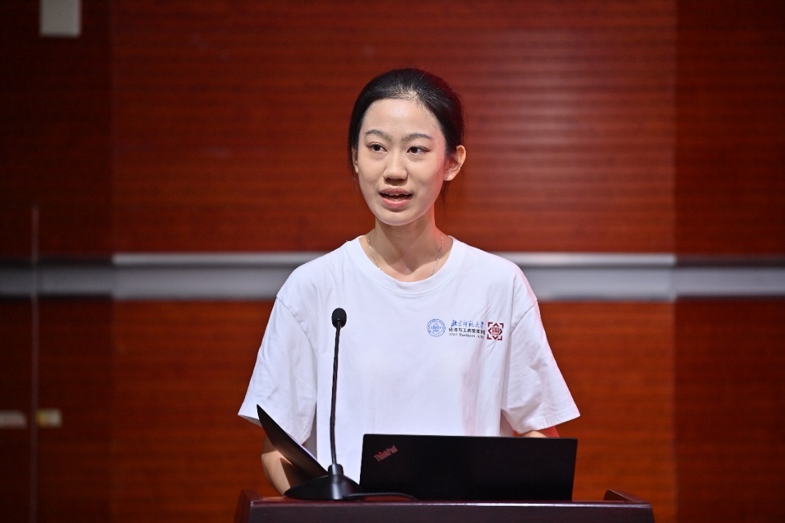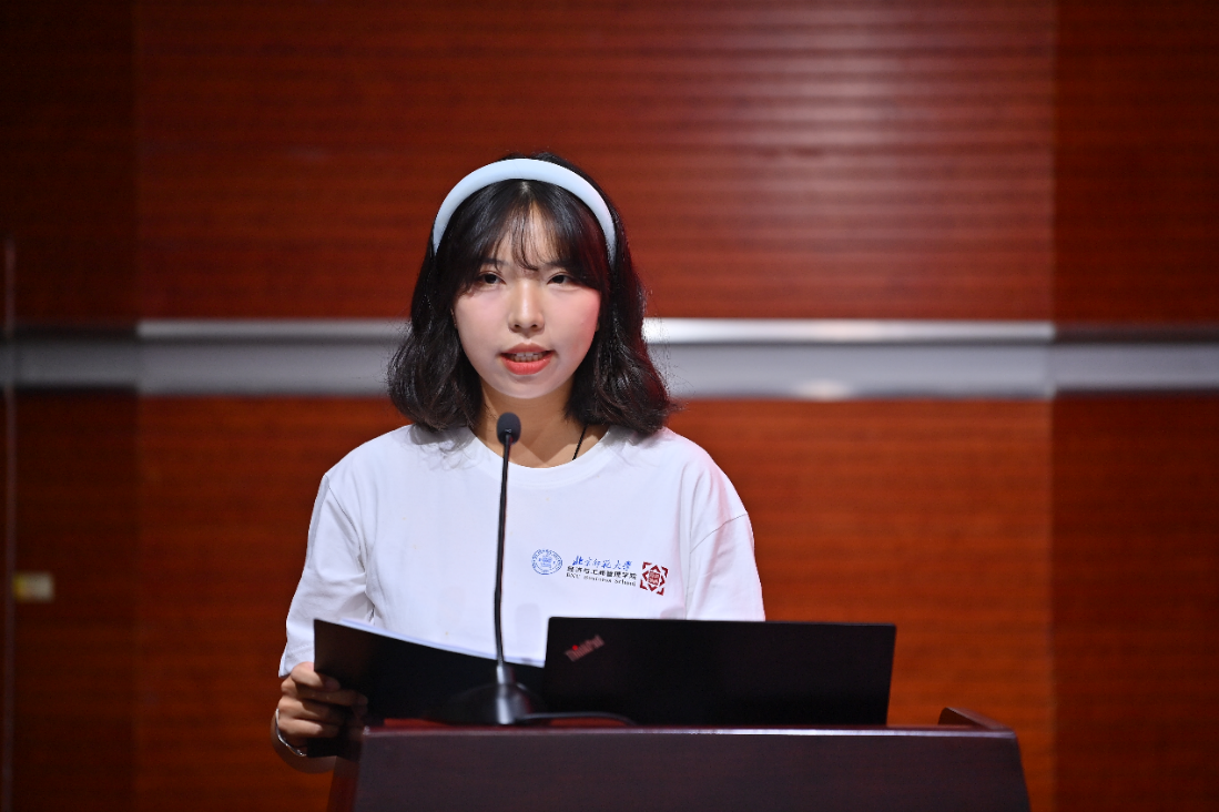2024级国际经济与贸易专业的郑秭璇作为本科新生代表发言,表达了对北师大及前辈们的敬仰和对大学生活的憧憬,激励自己作为新生要赓续传承北师大经管人的使命与担当。同时,她也展望了在北师大经管学院的新梦想,立志成为国家需要的人才,并承诺将个人追求融入国家发展,传承北师大优良传统,成为民族复兴的担当者。