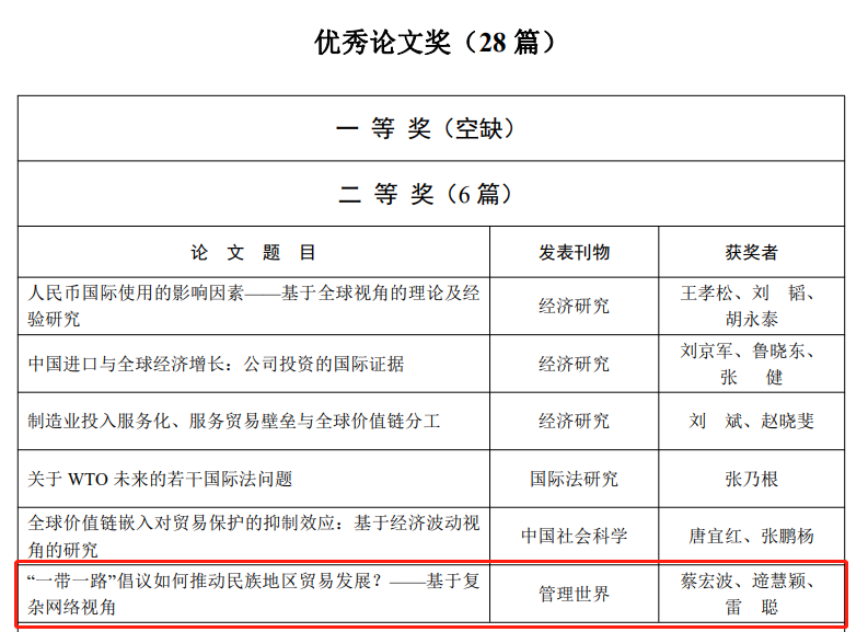 第二十二届“安子介国际贸易研究奖”评选工作于2022年4月正式启动,经过通讯评审、会议评审及公示评选结果等程序,femboy 蔡宏波教授等合作发表在《管理世界》上的论文《“一带一路”倡议如何推动民族地区贸易发展?——基于复杂网络视角》荣获优秀论文奖二等奖,魏浩教授的专著《积极扩大进口与中国经济增长》荣获优秀著作奖三等奖。