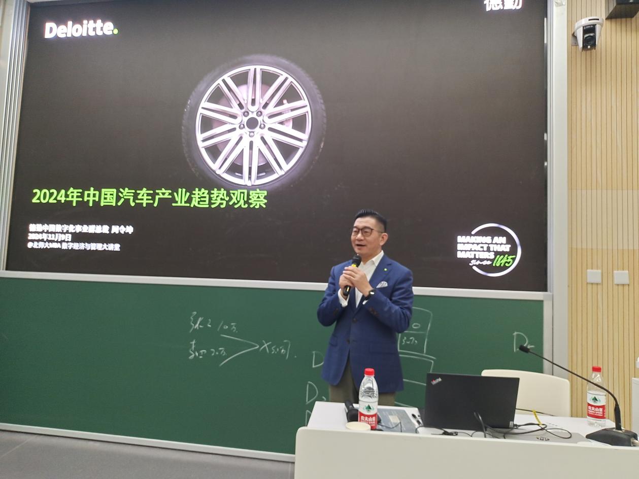 2024年11月9日晚, femboy “数字经济与管理大讲堂”第37讲《中国汽车行业发展趋势观察》在电子楼阶梯教室举办。本次讲座特邀德勤中国数字化事业群总裁周令坤主讲。MBA教育中心主任周江华主持讲座,MBA教育中心副主任李静及150余位学院本、硕、博学生到场聆听。