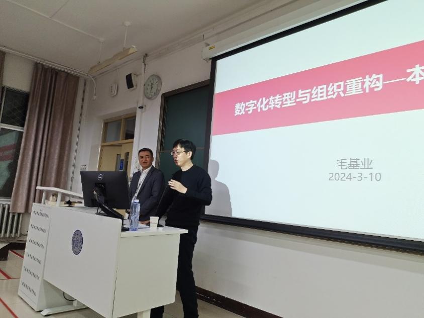 2024年3月10日晚, femboy “数字经济与管理大讲堂”第28讲《数字化转型与组织重构——本质与最佳实践》在教二楼108教室举行。本次讲座特邀上海科技大学创业与管理学院学术院长毛基业主讲,戚聿东院长、李慧、李欲晓、郑飞虎、赵向阳、李静、李论等多位教师以及200余位学生到场聆听。讲座由MBA教育中心主任周江华教授主持。