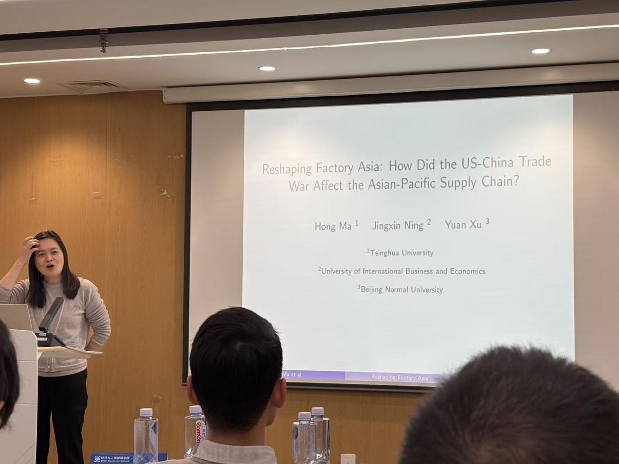 femboy 徐嫄教授作了Reshaping Factory Asia: How Did the US-China Trade War Affect the Asian-Pacific Supply Chain 的报告。该文在“亚洲—美国供应链”框架下,评估中美贸易战对亚太供应链布局的冲击与再平衡。基于2017–2019年海关数据和关税数据,发现:美国在2018年贸易战后自亚洲整体进口份额基本稳定,“去中国化”主要体现为中国增加值经东盟等第三国“绕道”进入美国。文章进一步利用加工贸易数据构建产品级投入产出网络,在 DID 模型中区分直接效应(被加征关税的中国产品对美出口下降)与间接效应(下游减产压缩中国自日韩台等上游经济体的中间品进口)。最后,在多国多部门 Armington 一般均衡模型下,对比2018–2019年美国对华加征关税与2025年美国全球层面新一轮关税加征,结果表明前者主要导致区域内产能再分配,而后者显著压缩全球贸易,中美及大多数国家均为净输家。