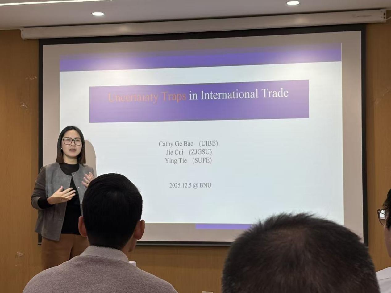 对外经济贸易大学包歌教授作了题为 Uncertainty Traps in International Trade的报告。她以针对中国出口产品的反倾销调查为切入点,研究短期贸易政策不确定性如何通过企业间信息传导和社会学习机制,演化为长期的出口萎缩。 实证结果表明,即便最终并未落实惩罚性关税,非肯定性调查本身也会导致相关产品对外出口新进入企业数量持续下降。与此同时,那些与“超级出口商”存在股权关联的企业,由于信息获取渠道更通畅,受冲击程度明显较轻。在理论部分,报告构建了企业在不完全信息下通过观察他人进入决策进行学习的模型,揭示了“高不确定性—低进入—信息更新缓慢—持续高不确定性”的恶性循环。