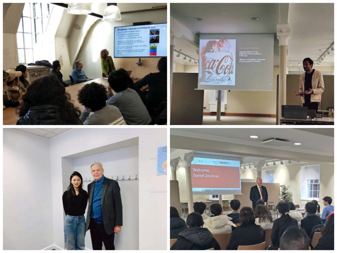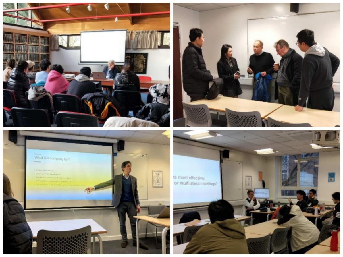 左上 李约瑟研究所前任所长古克里教授(Christopher Cullen)授课 右上 学生与国际商业领袖、英国四十八家集团俱乐部主席斯蒂芬·佩里(Stephen Perry)交流