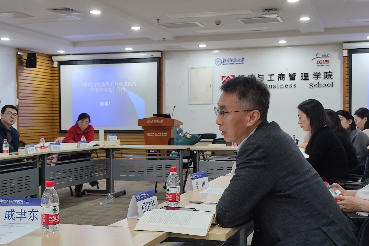 胡海峰教授、李由教授和杨澄宇教授在讨论环节先后发言。胡海峰教授率先表达了阅读李翀教授新书的感受,即从历史中找规律,解决当下的现实问题,并对当前“资本”概念界定不清晰的现状进行了批判。李由教授回顾了经管学院政治经济学教学科研发展历史,讨论了李翀老师新书的理论框架和实践意义,并对政治经济学的学科建设提出了建议。杨澄宇教授肯定了新书出版对于马克思政治经济学研究的意义,而后主要围绕新书中的第四章和第五章进行了讨论,并提出了自己的四点思考。