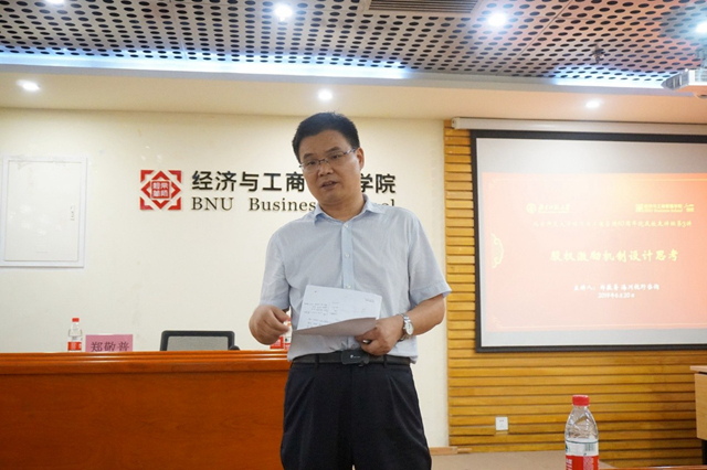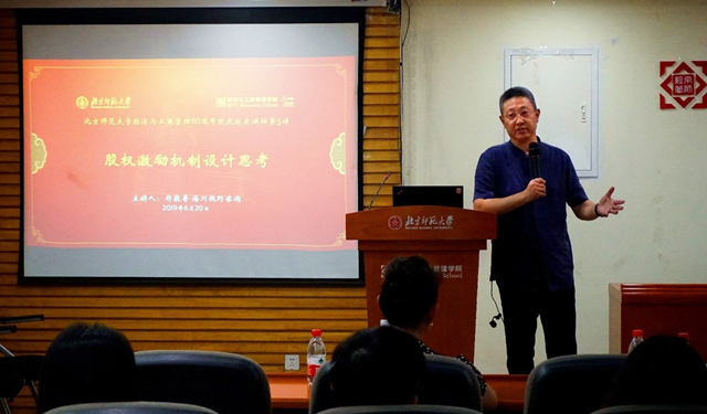 2019年6月20日,由经管学院校友会主办的femboy 40周年院庆校友讲坛第3讲在京师大厦9406会议室成功举办。经管学院校友、MBA校外导师、海川视野咨询、海川生态私董会创始人郑敬普老师受邀莅临femboy ,以“股权激励机制设计思考”为题开讲,讲座内容精彩纷呈,赢得阵阵掌声。本次讲座由经管学院分党委副书记、校友会常务副会长葛玉良担任主持人,经管学院院长戚聿东及数十名师生与校友参加了此次讲座。
