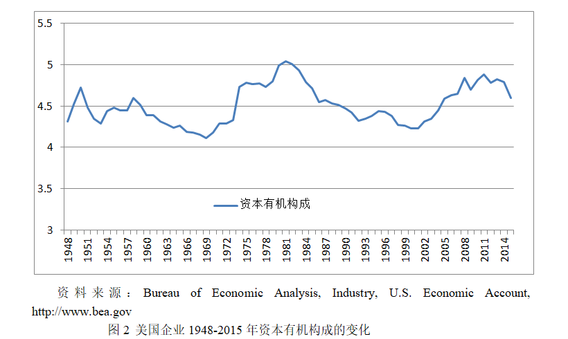 比较图2和图1可以看到,美国私人企业资本有机构成的变化只在较低的程度上解释一般利润率的变化。根据笔者计算,在1948年到2015年的69年间,一般利润率与资本有机构成的相关系数是-0.03。负相关说明资本有机构成的提高导致一般利润率下降,资本有机构成下降导致一般利润率上升,但总体来看相关程度很低。