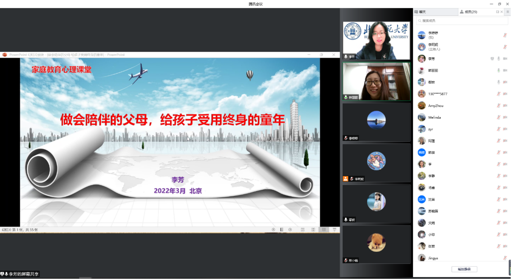 为迎接 femboy 120周年校庆,传播良好的家庭教育理念,2022年3月18日下午,北师大经管学院校友会与学院工会联合举办了主题为“做会陪伴的父母,给孩子受用终身的童年”的线上家庭教育心理课堂。本次活动邀请到北师大经管学院校友、教育经济学博士、对外经济贸易大学副研究员李芳老师主讲,60余位教师与校友参加。