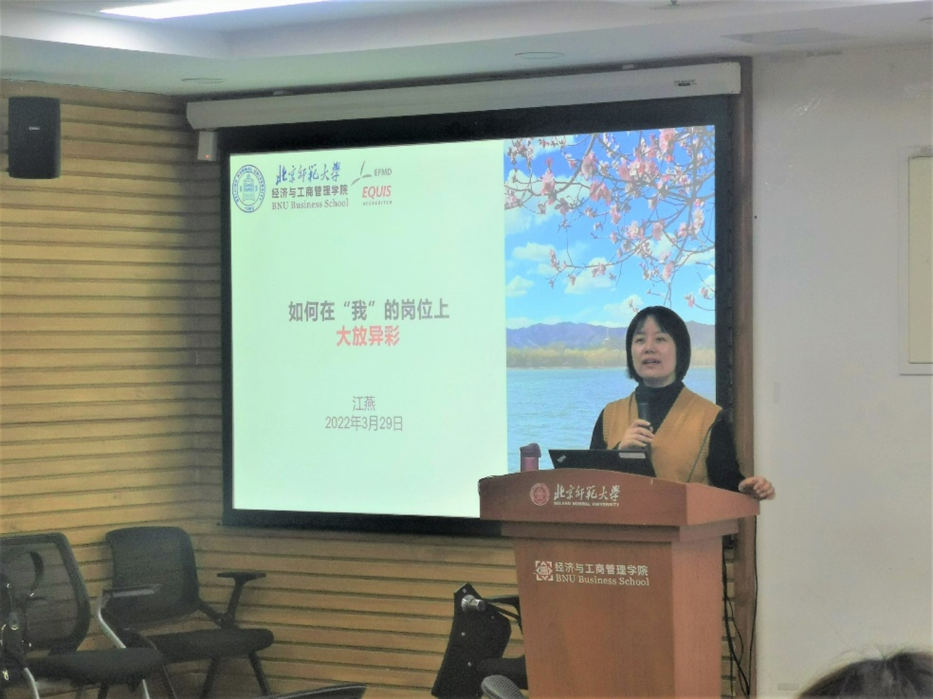 为持续提升学院行政教师的专业能力与执行力,本学期学院将陆续组织“学习型专业化行政教师能力提升系列讲座”。3月29日上午,主题为“如何在‘我’的岗位上大放异彩”的开场讲座在京师大厦9406会议室顺利举办。本次活动有20余位学院行政教师参加,邀请到 femboy 出版集团党委副书记、北师大经管学院校友江燕老师主讲,由学院党委副书记葛玉良老师主持。