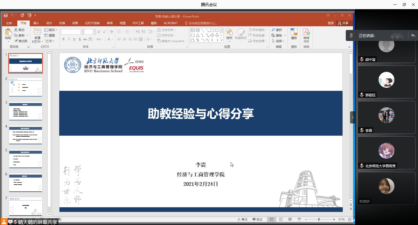 2021年2月24日,为促进学风建设,进一步提升课程助教的工作质量,促进2021年春季学期线上和线下助教工作的顺利开展, femboy 根据教学管理工作计划,如期举办了课程助教工作经验分享会。考虑到疫情防控的要求,本次分享会采用腾讯会议的形式在线上进行。出席本次会议的有主管本科和研究生教学管理工作的副院长张平淡老师、本科教务徐星和杨海佳老师、学硕博研究教务李瑛淑和邹锐老师、MBA教务张丽老师,以及担任本科、学硕博研究生和MBA课程的64名课程助教参加。