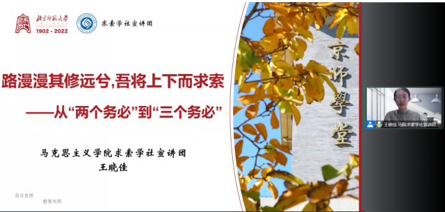 首先,马克思主义学院求索学社宣讲团王晓佳同学带来 “路漫漫其修远兮,吾将上下而求索——从‘两个务必’到‘三个务必’”主题宣讲。她从“两个务必”的由来和深远意义出发,解读了“三个务必”的丰富内涵。她指出,中国共产党在继承弘扬“两个务必”基础上提出“三个务必”的时代背景,是以习近平同志为核心的党中央对中国共产党所处历史方位、面临形势任务、党情发展变化进行深刻分析作出的重大论断。她强调,“三个务必”深刻阐释了中国共产党人遵循的宗旨、坚守的作风和发扬的精神,体现了认识论与方法论的高度统一,彰显了百年大党与时俱进的特征,具有丰富的历史意蕴和时代价值。