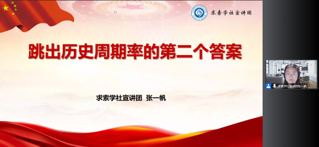 随后,张一帆同学带来 “跳出历史周期律的第二答案”主题宣讲。她从自我净化、自我完善、自我革新和自我提高等四个方面深刻阐述了自我革命是党跳出历史周期率的第二个答案。通过梳理党在各个时期关于推进自我革命的重要经验,她强调一部中国共产党的历史,是一部在自我革命中实现超越和发展的奋斗史,全面从严治党是新时代党的自我革命的伟大实践,开辟了百年大党自我革命的新境界。