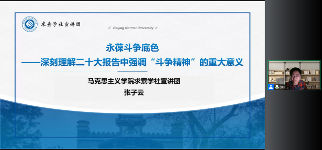 接着,张子云同学带来 “永葆斗争底色——深刻理解二十大报告中强调‘斗争精神’的重大意义”主题宣讲。他指出,坚持敢于斗争是党的百年奋斗实践得出的重要历史经验,敢于斗争、敢于胜利始终是党和人民不可战胜的强大精神力量。他从“敢于斗争”和“善于斗争”两个方面提炼出斗争精神的内涵,强调在新时代的前进道路上必须坚持发扬斗争精神,依靠顽强斗争打开事业发展新天地。他引用党的二十大报告中对青年的寄语,鼓励大家立志做有理想、敢担当、能吃苦、肯奋斗的新时代好青年,在全面建设社会主义现代化国家的火热实践中绽放绚丽之花。