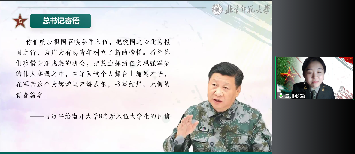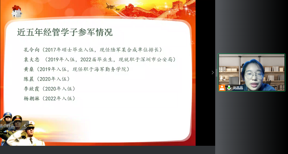 最后,征兵宣讲团的张颖和段金磊两位同学,结合个人的军旅经历,分享了军营生活带来的收获体会和成长改变,并引用习近平总书记给南开大学8名新入伍大学生的回信,鼓励同学们响应祖国号召积极投身军营,把热血挥洒在实现强军梦的伟大实践之中,实现“携笔从戎、报效国家”的人生价值。随后,高晶晶老师介绍了应征入伍的相关政策规定和近五年经管学子参军入伍的情况,希望有意参军入伍的同学贯彻新时代强军梦想,携笔从戎,建功军营。