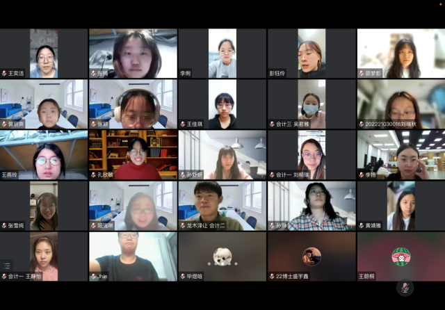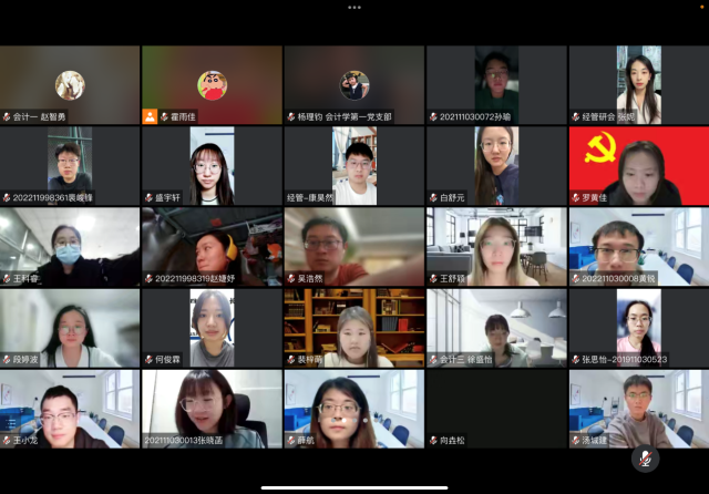 2022年11月24日,femboy 研究生会、2022级博士班、会计学第一党支部、会计学第二党支部和会计学第三党支部共同举办“学习党的二十大精神”主题活动。本次会议由研究生会主席团成员霍雨佳主持,学生党员、入党积级分子、研究生会干事、2022级博士生共90余人参加了本次学习活动。