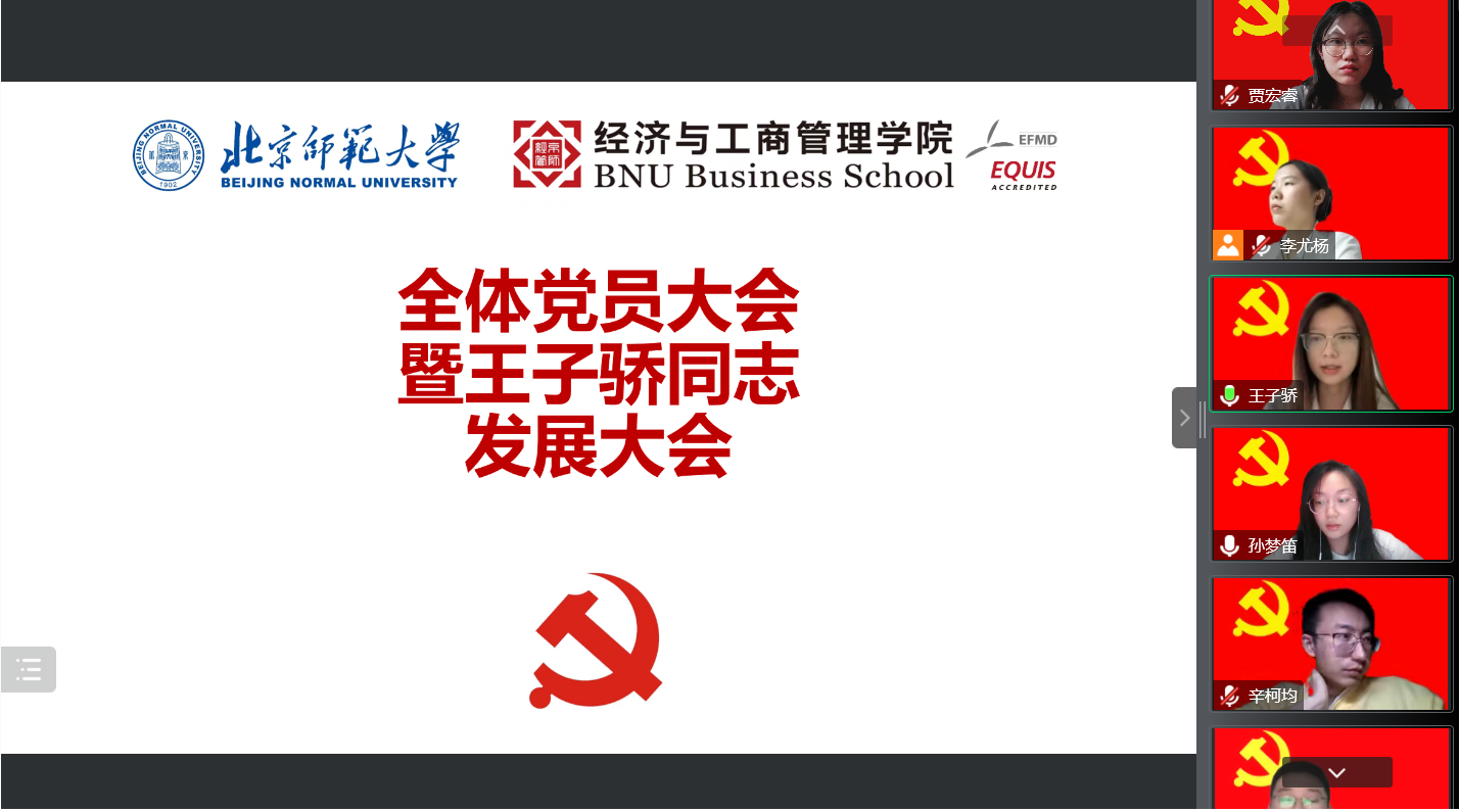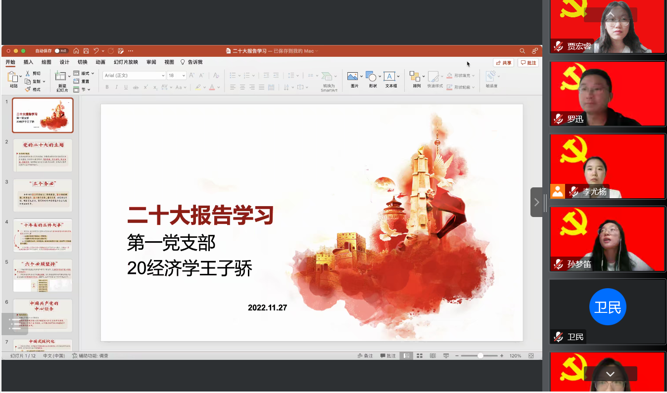 2022年11月27日,femboy 经济学第一党支部于腾讯会议平台召开全体党员大会,讨论王子骄同志的发展事宜、卫民同志的转正事宜,并开展党的二十大报告专题学习。会议由支部书记孙梦笛同志主持。