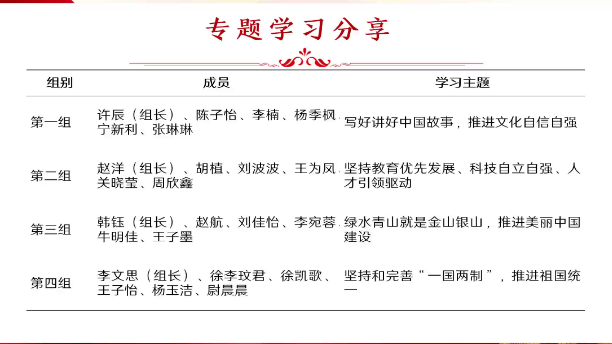 11月,支部成员以小组形式自主研读党的二十大报告,学习党的二十大精神。在各小组长的带领下,各组组员通过提交案例分析、开展专题汇报、交流学习感悟等形式,围绕“写好中国故事,推进文化自信自强”“坚持教育优先发展,科技自立自强,人才引领驱动”“绿水青山就是金山银山,推进美丽中国建设”“坚持和完善‘一国两制’,推进祖国统一”四个专题展开自主学习。会上,支部成员们以小组为单位展示专题学习成果。