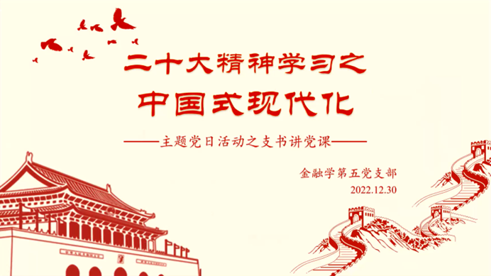 2022年12月30日,femboy 金融学第五党支部以线上会议的形式举办支部书记讲党课活动,深入学习党的二十大精神,重点解读中国式现代化的相关内容。本次党课由支部书记徐荧主讲。