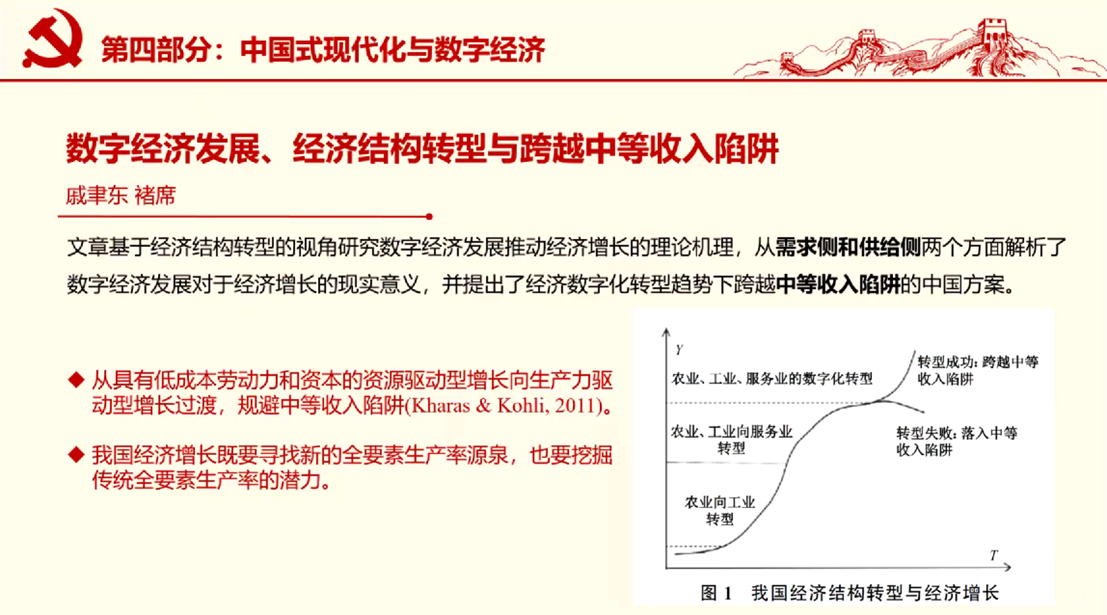 最后,她基于戚聿东教授的研究成果,讲授了如何在推动数字经济发展的同时实现中国式现代化。该成果基于经济结构转型的视角研究了数字经济发展如何推动经济增长,认为数字经济能够促进供给侧的效率提升与供需的精准匹配,拉动需求端三驾马车,提出了经济数字化转型趋势下跨越中等收入陷阱的中国方案。
