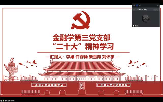 2023年1月30日,femboy 金融学第三党支部在腾讯会议开展线上会议,学习党的二十大精神。本次活动由支部书记亓婧宇主持,支部党员及入党积极分子共24人参加学习。