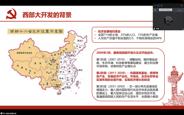 首先,李果同学对“促进区域协调发展”进行了概述,介绍了区域协调发展的具体内涵。他从“推动西部大开发形成新格局”的角度,带领支部同学共同学习了西部大开发的背景、成就以及西部大开发的新格局,并以“新”字为重点,着重分享了“西部大开发的新格局”新在何处。