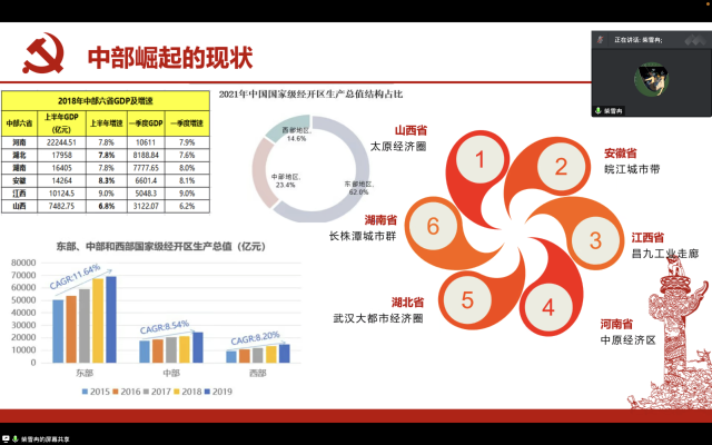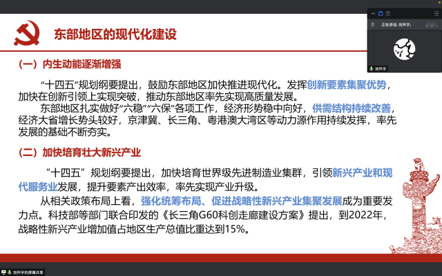 许舒畅同学着重介绍了“新时代东北振兴”的基本内容与政策举措,使支部同学们对新时代东北地区的发展前景有了新的认识。柴雪冉同学则将重点放在“中部地区崛起”的内涵与现状上,以郑州新区等作为案例进一步加深同学们的认识。刘怀宇同学重点介绍了东部地区的现代化建设,并主要讲解了党的十九大以来东部地区现代化建设的成就。