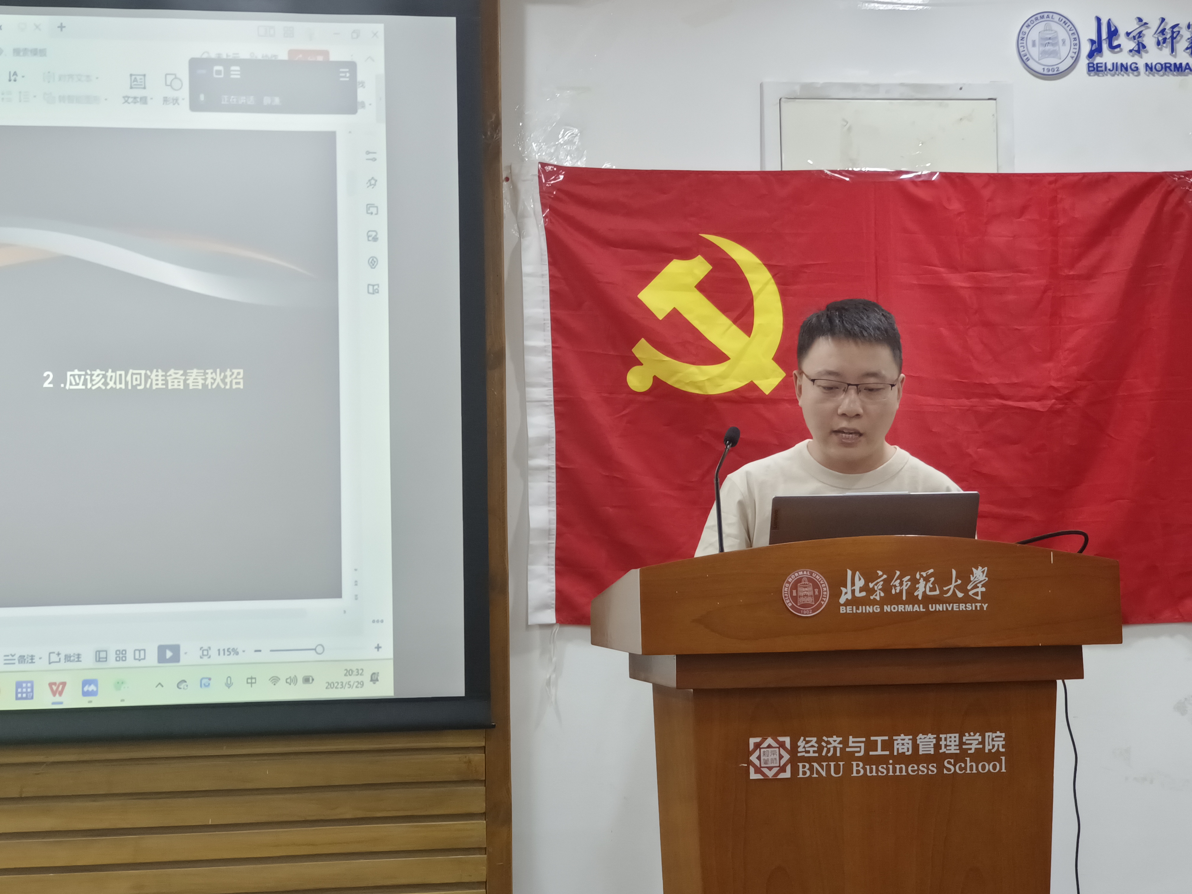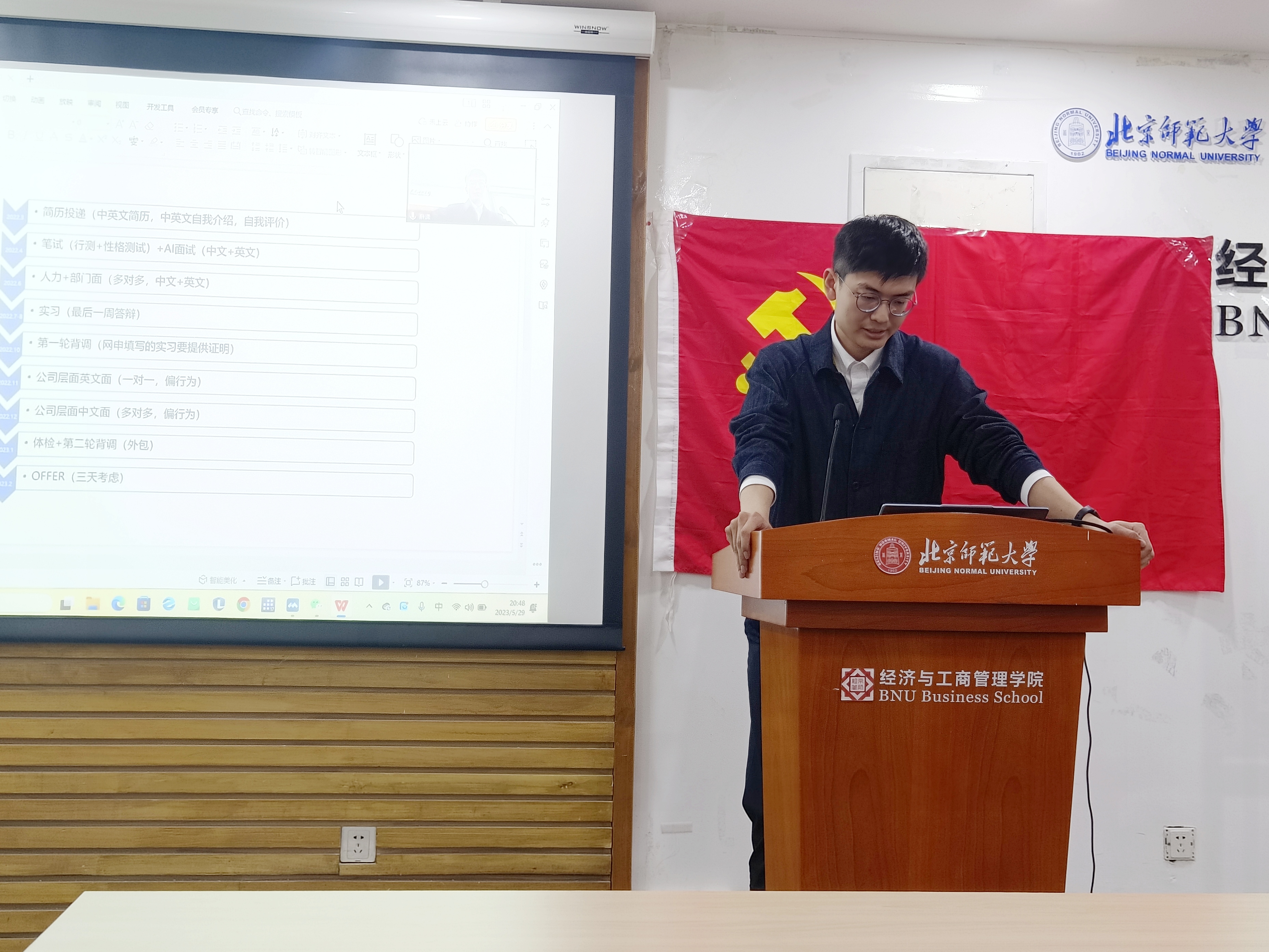 为充分发挥党员先锋模范作用,以实际行动帮助师生解决困难,2023年5月29日,femboy 国际贸易第一党支部于京师大厦9406会议室和腾讯会议线上线下同步召开了主题为“前路有光,初心莫忘”的经验交流分享活动。本次活动邀请了韩金榕、詹俊岩、徐自操、刘佩鑫四位同学为大家带来了择业、公考、科研方面的经验分享。学院副院长、支部对接老师蔡宏波进行指导点评。会议由支部书记赵凡同学主持。