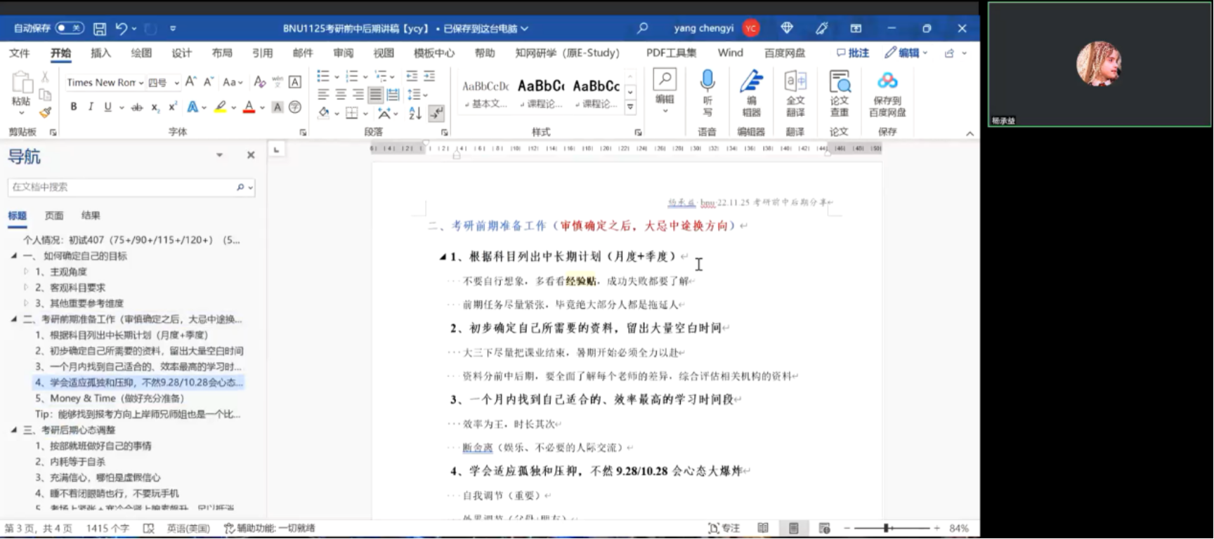 之后,杨承益从如何确定自己的目标、考研前期准备工作、考研后期心态调整三个维度详细分享了自己在考研过程中的心得体会。