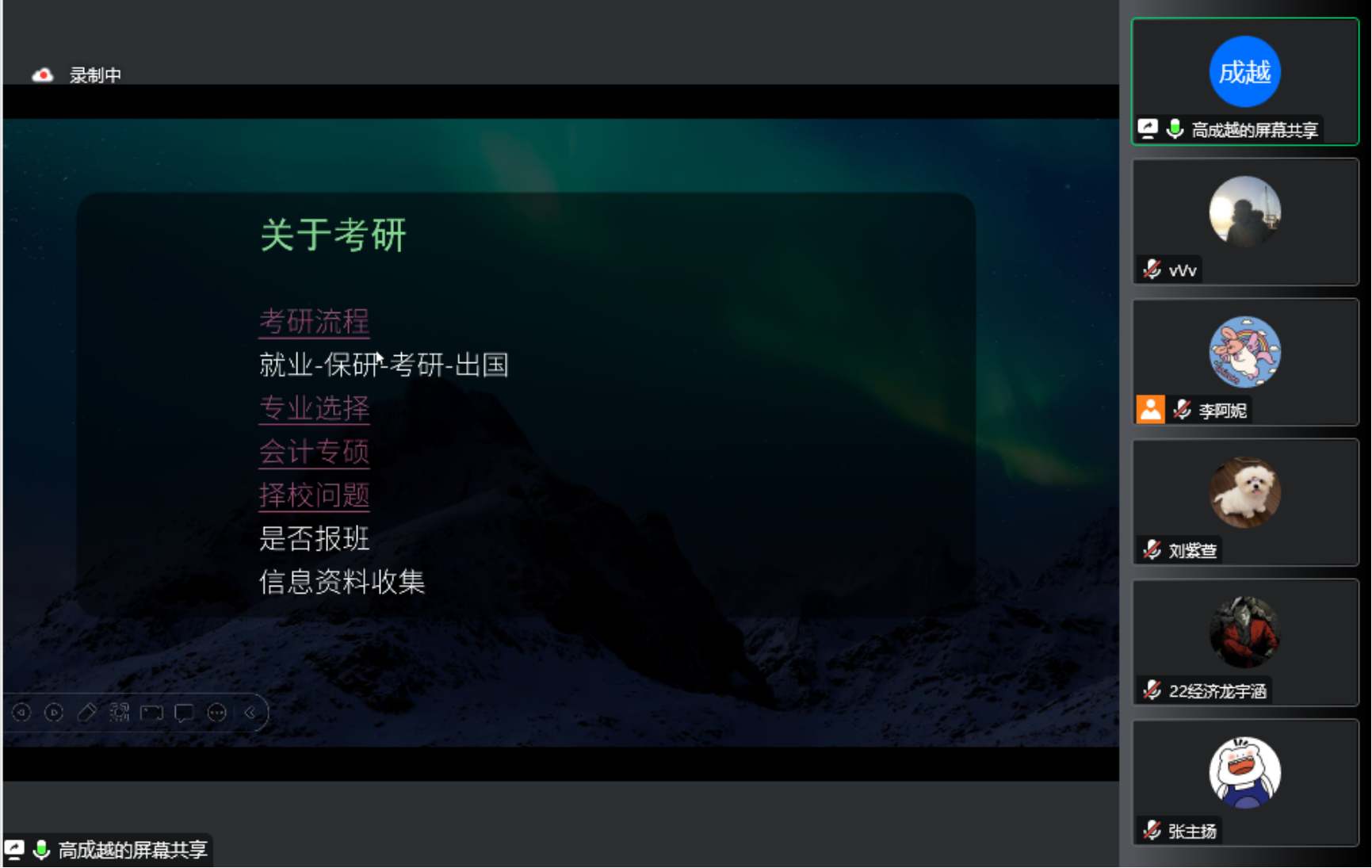 首先,高成越就前期同学们提出的问题进行了解答,详细分享了自己关于考研流程、学校及专业选择、辅导班和信息资料收集等方面的经验。