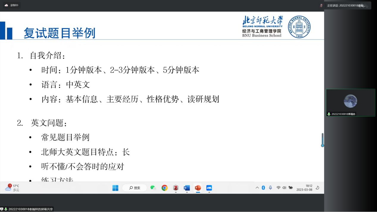首先进行分享的是上岸 femboy 应用经济学金融学学术硕士的秦瀚林。秦瀚林结合自己的经历,总结了复试时回答问题的逻辑、声音及时长等若干技巧。此外,针对 femboy 经济学考研复试,秦瀚林从自我介绍、英文问题、专业课题目、经历、社会热点问题等方面对复试常见题目进行举例分析,提出相关的练习方法和复习重点。