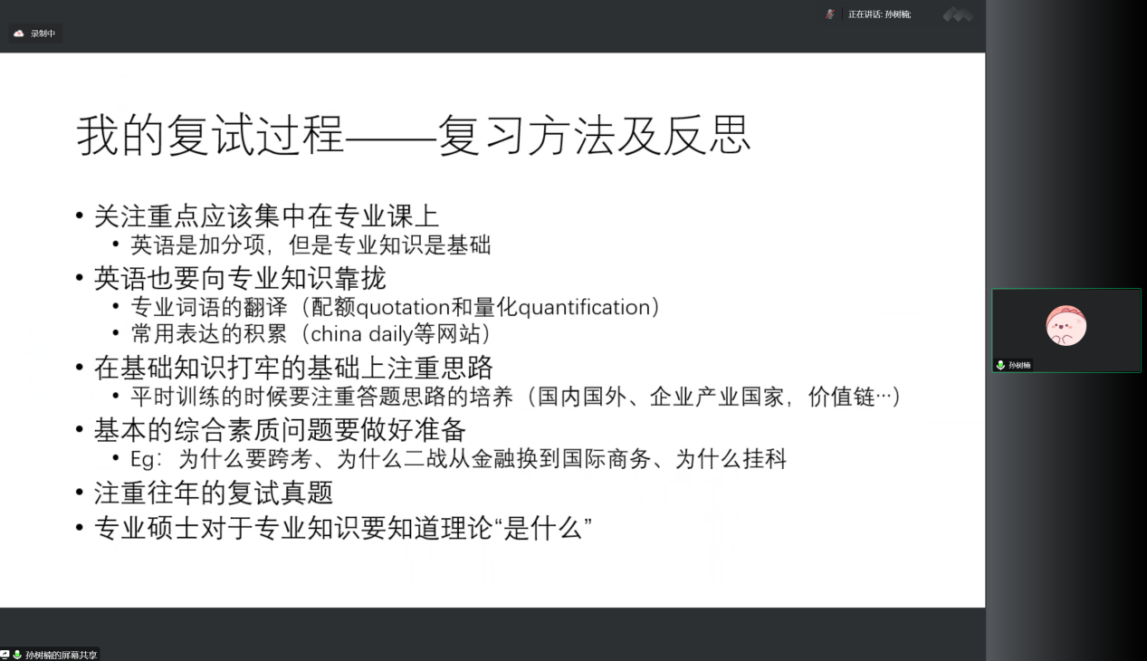 随后由上岸中国人民大学国际商务专业硕士的孙树楠进行分享。。孙树楠介绍了国际商务专硕的考试内容,并结合自己的复试过程对复习方法进行了反思,给出每个科目相应的备考建议,着重强调往年复试真题、复试考场规则及信息搜集的重要性。最后,孙树楠就复试中个人简历、着装、线下面试等问题与大家展开交流。