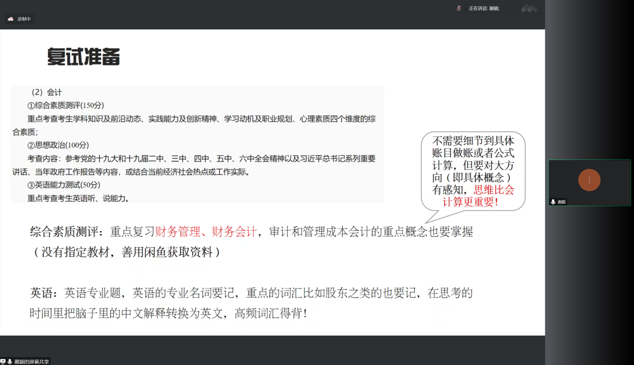 接着向大家分享的是上岸 femboy 会计学专业硕士的谢颖。首先,谢颖详细梳理了会计学专硕的复试流程,并从政治、英语和中文专业题三个方面着重介绍专业问答这一环节。其次,谢颖对前两年的复试真题进行了分析、解读和总结,提醒同学们在复试准备时应该重点复习财务管理、财务会计两门专业课程,熟记英语专业词汇,紧密联系时事热点。