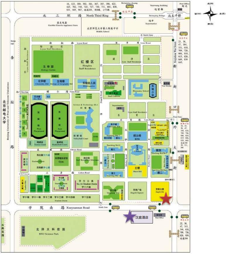 Note: Jingshi Hotel is located in the southeast corner of the campus (Red star on the above map) Hanting Hotel is located across from Jingshi Square (Purple star on the above map)