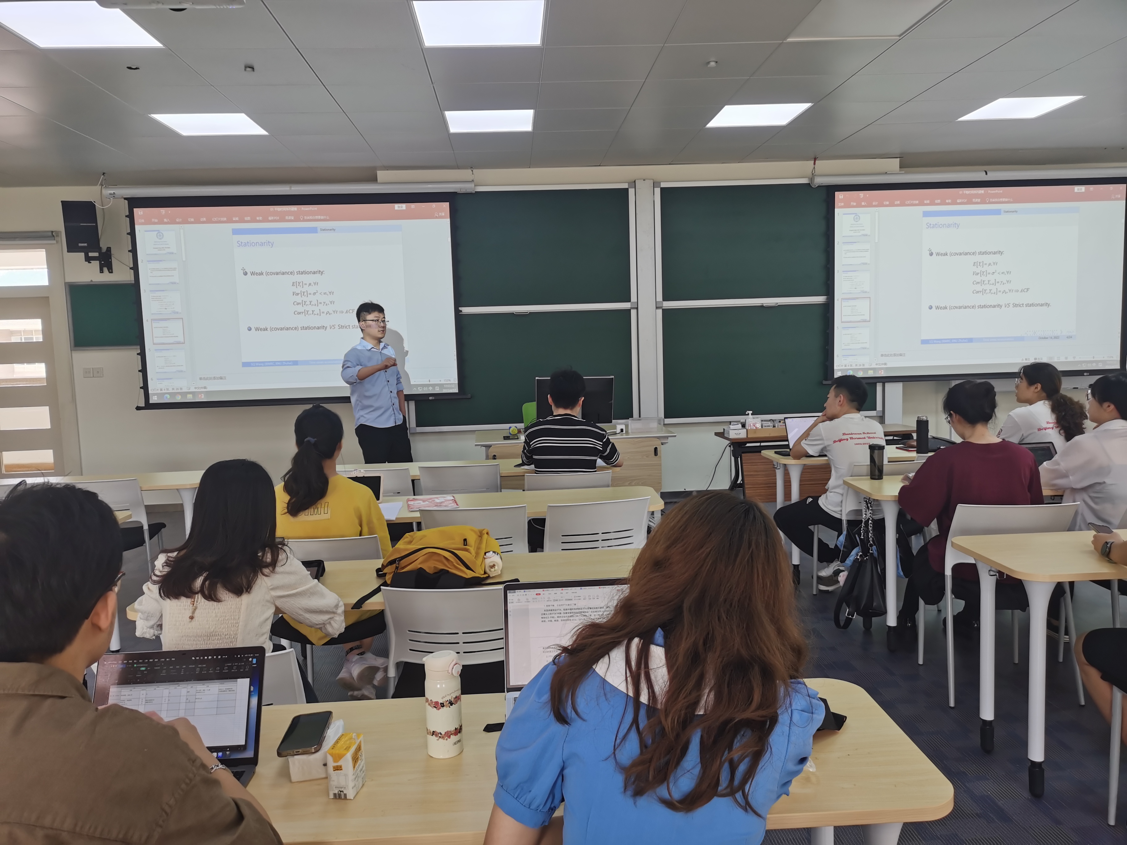王老师先从“研究角度”入手,向同学们指出可以从时间序列角度思考问题,这对深入开展论文研究至关重要。为了便于同学们更加直观地感受经济学中“平稳性”的重要性,王老师以理论阐述与实践案例结合的方式——通过随机过程引入时间序列数据,同时举例说明了当前中西方使用的不同货币政策对经济的影响,通俗易懂地向同学们讲述了单条时间序列的基本含义。王老师强调,如果在写作中要使用ARMA模型进行建模,前提是时间序列必须是平稳的,这是一篇优秀论文所具备的特质。