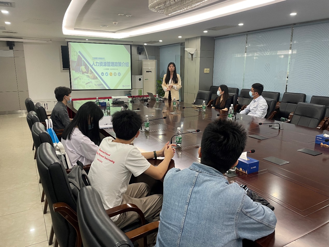 交通银行股份有限公司珠海翠微支行行长张欣宝、人力资源部招聘总监陈婧熙、个金部副总经理蒋沅袁热情接待了师生一行。在交通银行历史博览馆,同学们了解到经过三十年的发展沉淀,交通银行珠海分行现有管理资金逾700亿元,管理贷款逾800亿元。珠海分行制定了“十四·五”发展规划,提出了新目标和任务,即实现“双千工程”(存款、贷款规模均超千亿元)。基于交行珠海分行业务的持续良性发展,珠海分行通过"压担子,铺路子"的方式,积极帮助同学们完成从新人到职场专业人士的蜕变。